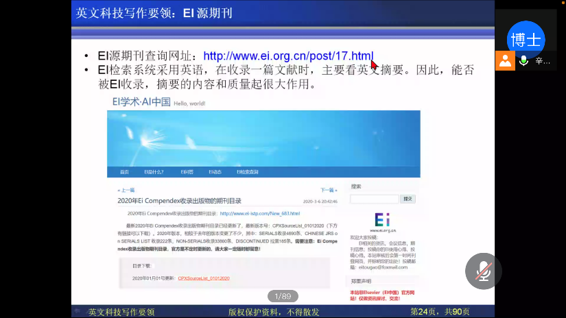 讲座中辛教授详细的为大家介绍了何为SCI源期刊以及期刊分区的依据,并推荐了分区以及影响因子查询神器“中国科学院文献情报中心“(微信小程序)来帮助大家快速了解各个期刊具体状况。接着教授讲到ESI这一概念,ESI是目前普遍使用于衡量学科研究绩效、跟踪学科发展趋势的分析评价工具,并借此鼓励同学发表高水平SCI论文。讲到EI源期刊板块时,辛教授强调英文摘要的质量好坏对是否录用起到很大作用并为我们推荐了众多选刊工具如Google Scholar、LetPub、小木虫、丁香园等。