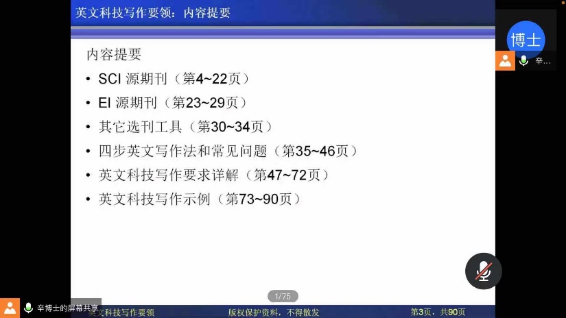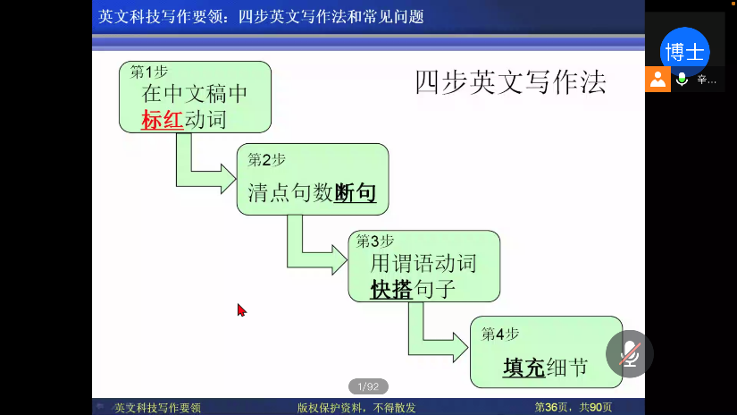 讲座开篇,辛教授指出当代老员工英文写作水平不够,独立完成英文科技文献写作困难等问题,并对症下药从最基础的源期刊讲起,承接选刊工具介绍,引出四步英文写作法以及常见问题,最后结合同学的论文加以修改以便员工学以致用。