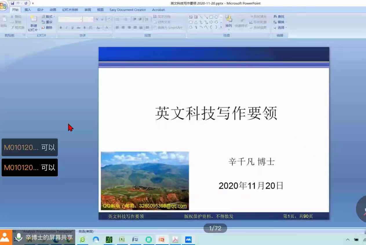为了提高研究生英文科技写作能力,帮助其发表高水平英文论文、增强国际交流能力,2020年11月20日上午,公司诚邀2020年太阳成集团海外名师项目获得者辛千凡教授线上开展题为“Key Techniques of English Scientific Writing(英文科技写作要领)”的主题讲座,有近300名研究生参与讲座。辛教授于美国华盛顿大学获得机械工程硕士、博士学位,现担任美国HXK技术公司主管,英文底蕴深厚,写作技巧精湛。
