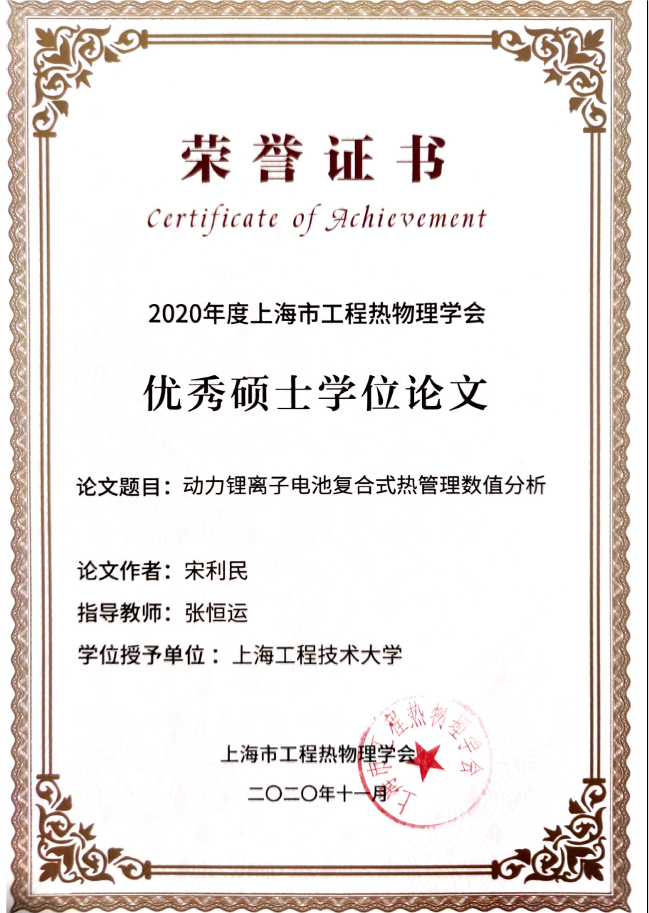 上海市工程热物理学会第九届会员代表大会于2020年11月29日在上海交通大学召开,会上颁发了2020年度上海市工程热物理学会优秀博士学位论文奖和优秀硕士学位论文奖,太阳成集团tyc33455cc宋利民同学的硕士学位论文《动力锂离子电池复合式热管理数值分析》,荣获学会优秀硕士学位论文奖,指导老师为张恒运教授。本届参评论文为2018年1月1日至2020年6月30日获得博士硕士学位者的学位论文。