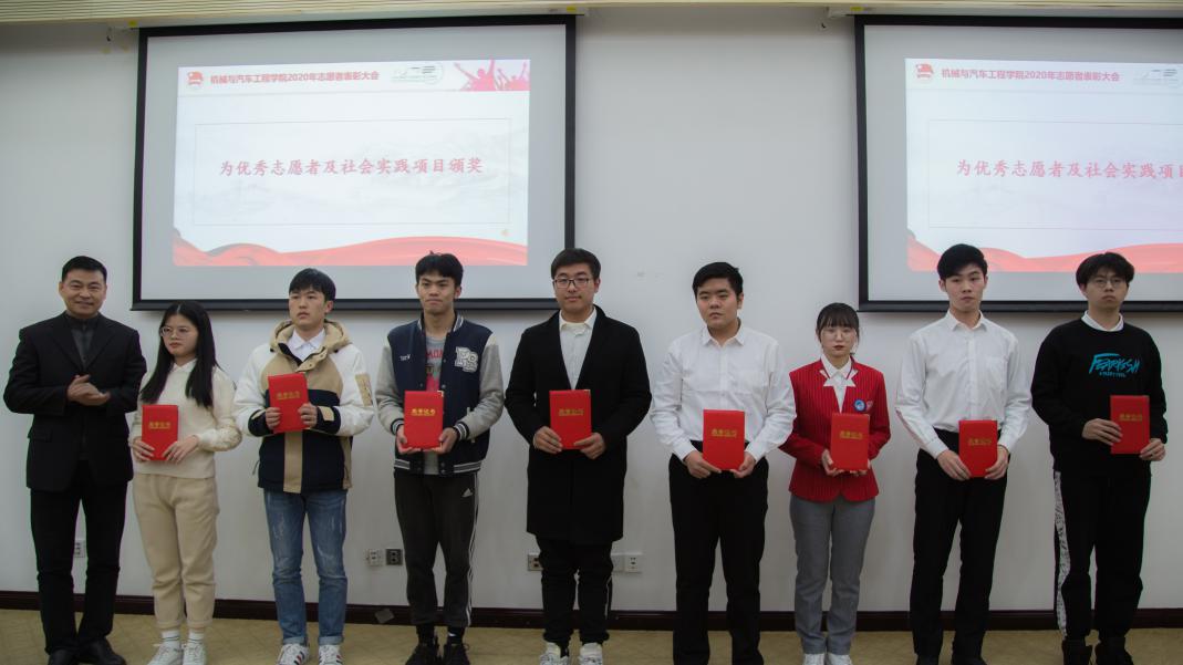 会上,谢腾骁老师总结了学院一年来志愿服务工作取得的成绩。他指出,在新冠肺炎疫情防控的特殊背景下,学院的志愿服务工作呈现新特点、取得新发展。2020年,公司有712名员工参与志愿服务,累计时长达9571小时。大会共表彰12个先进个人,5支优秀团队,涵盖疫情防控服务、迎新服务、进博会服务、献血服务、垃圾分类等多个领域、多个项目,充分展现了机械与汽车学子的良好精神风貌,受到社会各界的一致好评。王东阳老师为优秀志愿者及优秀社会实践项目颁奖,向他们表示祝贺及鼓励。