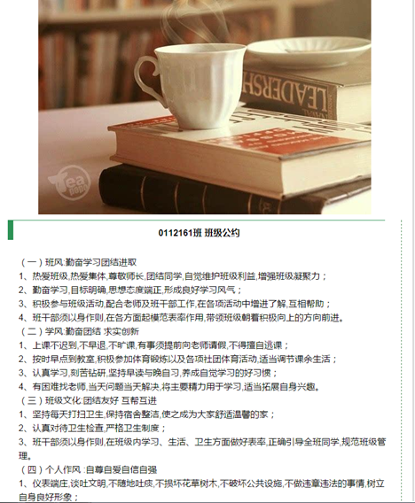 各班级提交的班级公约内容详实,均能够彰显各班专业特色,体现了当代青年人的历史责任担当和积极向上的青年态度,集中体现了社会主义核心价值观。学院从各班的班级公约中择优选择在学院官方微信上进行展示,希望在学院内形成“风清气正 ,奋发有为” 的班风氛围, 打造积极向上的班级文化作为班级的精神营养,深深植根于员工心田。希望同学们能够在班级公约的指导下,不忘初心,砥砺前行!