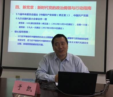 会上邀请了“上海市高校最美思政课教师”于凯教授就“深入贯彻十九大精神,认真学习新党章,全面推进“立德树人”工作”作主题发言。于凯教授以“举旗帜、指方向、明方略、绘蓝图”四句话以及“六个新——新时代、新思想、新认识、新战略、新任务、新征程”高度解析十九大报告内涵;以“新时代党的政治纲领与行动指南”来评价新党章,介绍了新党章的核心思想、总纲及各章条文修改部分,新党章的修订有利于全党把握党的指导思想与时俱进,用习近平新时代中国特色社会主义思想武装头脑、指导实践、推动工作,有利于强化基层党组织政治功能,推动全面从严治党向纵深发展;关于课程思政时,于老师强调“立德为基、树人为要”作为教育事业的根本任务,遵循思想政治工作规律、教书育人规律、员工成长规律这“三个规律”,立德树人、以师为范,不断提高工作能力和水平。