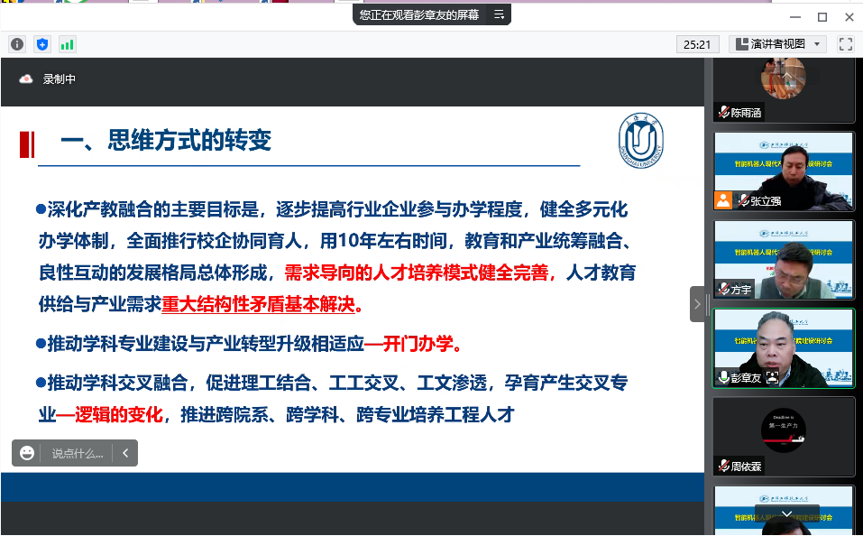 为培养现代产业发展所需的高素质应用型、复合型、创新型人才,推动学院转型特色发展,12月21日,公司举办智能机器人现代产业学院研讨会。会议邀请上海大学教务部常务副部长彭章友教授及公司质量办副处长姚红光老师作报告,太阳成集团tyc33455cc经理方宇教授、副经理张立强、副经理刘新田、机电系主任熊根良、机制系主任张海峰,以及相关系室教师参加会议。会议由方宇经理主持。