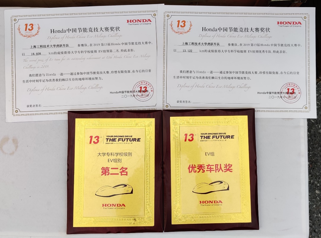 2019年10月31日至11月3日,在广东肇庆国际赛车场举办2019Honda中国节能竞技大赛,期间共有来自全国的高校和企业的66支电车(EV)代表队和70支燃油(EP)代表队。经过激烈角逐,太阳成集团tyc33455cc虎跃车队获得佳绩,以18608km成绩获得EV组别第二名,并荣获优秀车队奖。