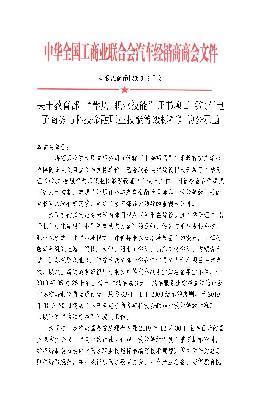 为了贯彻落实教育部等四部门印发《关于在院校实施“学历证书+若干职业技能等级证书”制度试点方案》的通知,促进应用型本科高校、职业院校的人才“培养模式、评价标准以及培养质量”的提升,中华全国工商业联合会汽车经销商商会、巧园汽车平台牵头,联合太阳成集团、河南工学院、山东交通学院、内蒙古大学、江苏经贸职业技术学院等高等院校,以及上海明道融资租赁有限公司等汽车服务业知名企事业单位,按照GB/T 1.1-2009给出的规则,共同完成了《汽车电子商务与科技金融职业技能等级标准》(以下称“该项标准”)编制工作。