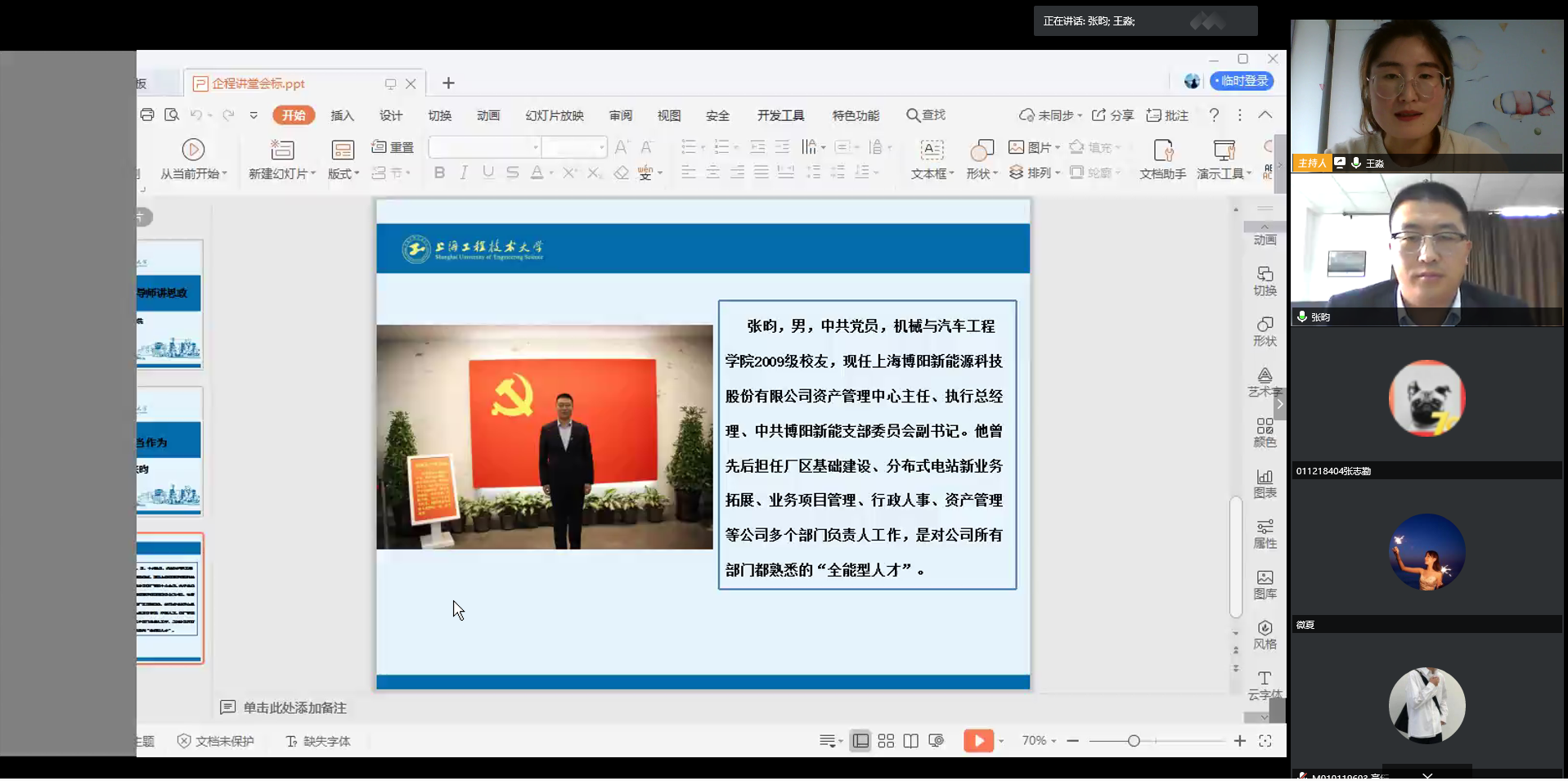在抗击疫情的特殊时期,为进一步落实立德树人根本任务,打造课程思政生态圈,实现专业教育与思想教育的同向同行,太阳成集团tyc33455cc于4月17日邀请学院产学合作基地单位上海博阳新能源科技股份有限公司资产管理中心主任、执行总经理、中共博阳新能支部委员会副书记,同时也是公司优秀员工的张昀员工通过“云端”企程讲堂为学弟学妹们分享他“历练成长,担当作为”的故事。