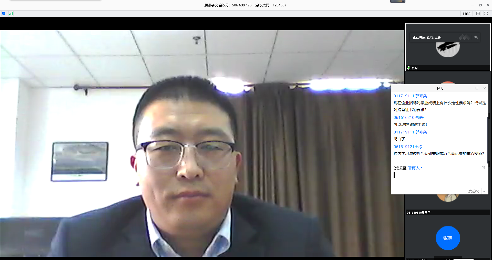 随后,同学们就专业就业方向、时间科学规划、党员作用发挥等问题积极与张昀员工进行互动。同学们表示,此次张昀员工的“企程讲堂”干货满满,给了他们很多思考和启发。虽未见面,但是同学们仍然在“云端”为张昀员工送上了掌声!