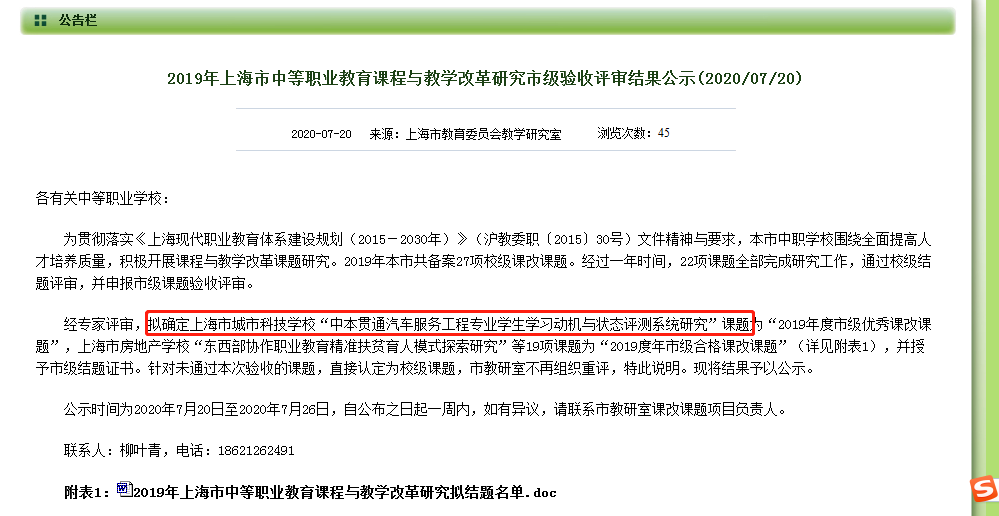 近日,市教委教研室公布了2019年上海市中等职业教育课程与教学改革研究市级验收评审结果,共评选出市级优秀课改课题1项,市级合格课改课题19项。经专家评审,由汽车服务工程系与上海市城市科技学校联合申报的课题“中本贯通汽车服务工程专业员工学习动机与状态评测系统研究”唯一获评为“2019年度市级优秀课改课题”。